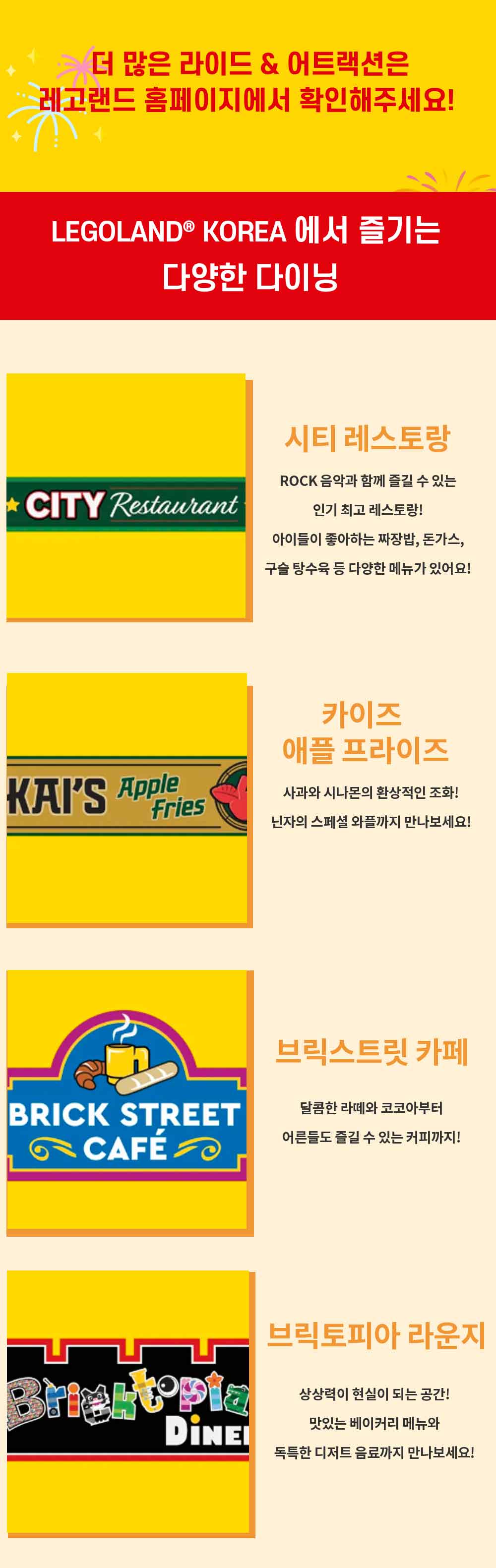 -보호자 동반 탑승: 놀이기구 별 신장 요건을 충족하지 못해 동반자가 필요한 경우, 만 16세 이상의 보호자가 동반 필수