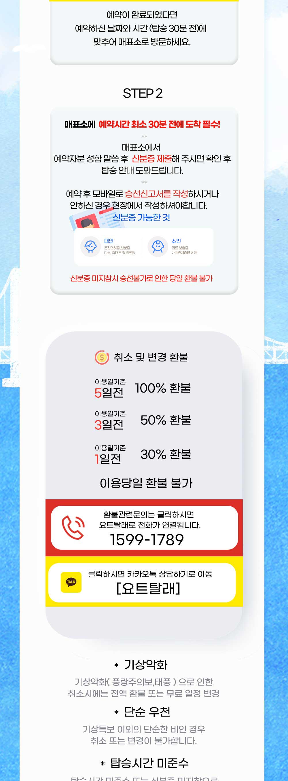 ※ 탑승시간 미준수로 인한 탑승 불가시 or 신분증 미지참으로 인한 탑승 불가시에는 환불 또는 변경이 불가능 하오니