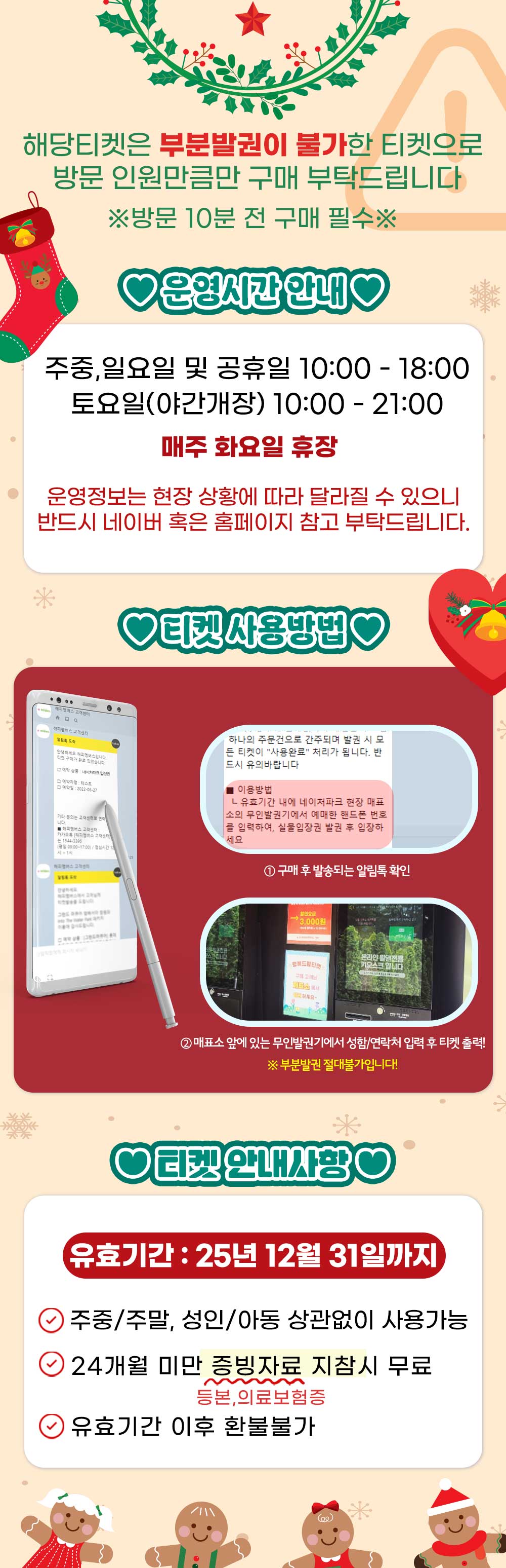 본 티켓으로는 단체 입장이 불가하며, 단체 구매 및 입장은 현장 문의 혹은 네이처파크 1688-8511로 문의 부탁드립니다.